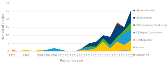 This section aims to answer RQ2 (what are the main tools and approaches used for the economic analysis of BESS?). For this, relevant information about the analyzed studies was extracted and summarized in Table 2. It is interesting to note that the unit of analysis is a key methodological decision for studies interested in the economic analysis of BESS, influencing choices in terms of tools and methods used for this purpose. Thus, Table 2 was organized according to the unit or the scale, which followed classification previously used by the literature [26]: (A) non-domestic, (B) residential, (C) commercial and industrial, (D) region/community, (E) utility scale. Figure 9 presents the evolution of the studies over the years based on the unit or the scale.