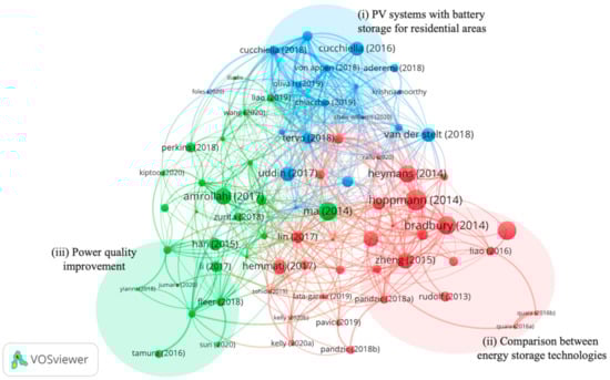 Therefore, it was possible to have a greater understanding about the cluster (i) formed using the concept of bibliographic coupling network. It was observed that, in the articles concentrated at the apex of the triangle formed by the clusters (see Figure 10), the authors focused on research especially about the economic feasibility of PV energy on a residential scale. Moving slightly away from this apex, it was possible to find articles such as the one by Aderemi et al. [28] that analyzed the viability of PV energy on a non-domestic scale (isolated) or Krishnamoorthy et al. [77], in which it is faced with an increase in scale (region/community) and hybrid systems involving RES. When moving towards the cluster (ii), it was possible to find articles that developed economic and financial studies that can help in the decision-making processes between different energy storage technologies (e.g., between electrochemical batteries), as were the cases of Martinez-Bolanos et al. [59] and Barcellona et al. [34], who dealt with the PV source on a residential and a commercial and industrial scale, respectively, but performed the comparison between different technologies. On the other hand, when moving towards the cluster (iii), it was possible to identify articles such as Dumont et al. [49] and Uddin et al. [19], which, despite the studies being carried out on PV energy at the residential scale, involved issues of energy management or reliability (e.g., load shifting and peak shaving).