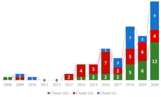 To address RQ3 (what are the key paper clusters presented by the referred literature?), clustering techniques and content analysis were combined. Mapping and clustering techniques are often used in systematic reviews [110,111]. The purpose of using these techniques is to provide an overview of the structure of a network, answering questions such as “what are the main fields of investigation in a scientific domain?” or “how do these topics relate to each other?”, among others.