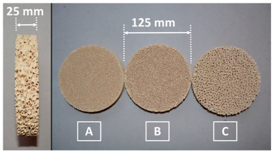 Volumetric absorbers used in experimental tests. partially stabilized zirconia (PSZ) foam filters with pore density: (A) 30 PPI (pores per inch), (B) 20 PPI, and (C) 10 PPI.