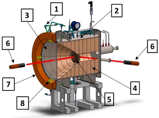 Reactor Cross-section. (1) Gas inlet manifold, (2) Reactor body, (3) Flat Glass Window, (4) Alumina thermal insulator, (5) Volumetric absorber, (6) Pyrometers, (7) Water-cooled aperture stop, (8) Window cooling nozzles.