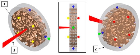 Distribution of thermocouple probes in the porous absorber (1): front face (yellow), rear face (red), absorber edge (blue), and insulation interface (green) (2). The red line indicates the direction of pyrometer readings (3).