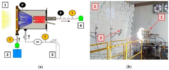(a) Solar reactor operation diagram showing the temperature (T) and pressure (P) sensors, the mass flow controllers (MF), and the gas inlet/outlet, also is illustrated the incoming radiation flux (1), the water reservoir (2), the compressed air tank (3), and the air extractor (4). (b) The solar reactor installed in the high radiative flux solar furnace (HoSIER), the reactor (1), solar concentrator panel (2), and front pyrometer (3).
