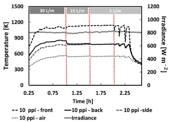 Figure 5 shows the experimental temperature data obtained of the porous absorber with 10 PPI, temperature values correspond to the front and back faces and the porous medium’s edge, in each case, values are an average over the four sensors located in these surfaces (Figure 3). The behavior of this porous absorber is representative of the typical trend of the different porosities studied in this work. The vertical red lines indicate when the flow rate is changed. The most noticeable transient temperature occurs during the first 0.5 h of operation at a flow rate of 30 L/min−1, as can be appreciated in the graph. Nevertheless, the full stabilization required 1.0 h at least. When the steady-state is reached, the temperature difference between the two faces of the absorber is 338 K, this temperature difference remains constant if the solar irradiance is kept at a value close to 800 W m−2, even changing the airflow rate. The experiment continued with the flow rate of 10 L/min−1 for 0.5 h to compensate for minor temperature oscillations due to solar irradiance variations. Then, the flow rate was reduced to 5 L/min−1, and the system was allowed to stabilize again. In the last segment, the flow rate was not changed, but the solar furnace shutter was closed and opened in intervals of 0.4 h, to simulate the system’s response to dispersed clouds. During the shutter’s closures, the absorber’s front face temperature decreased by 110 K, 209 K, and 315 K for the first, second, and third closures. Temperatures presented a delayed response to closures due to the reactor’s large thermal mass.