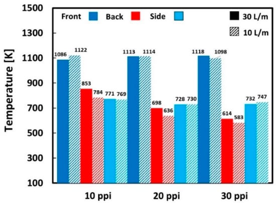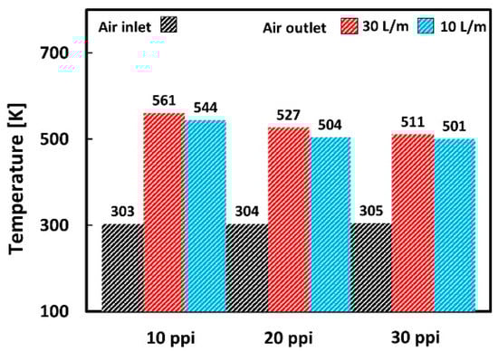 Figure 6 shows a remarkable dependence on the temperature difference between the absorber’s faces and the pore density (PPI) []. Considering that pore density is inversely proportional to the pore diameter, thus 10 PPI absorber has the largest pores, and it presents the smallest temperature difference between the front and back face, while the 30 PPI absorber has the smallest pores and the largest ΔT. This behavior can be attributed to the easier passage of the concentrated solar radiation through the largest pores. This higher back face temperature of the porous absorber for larger pore diameters also translates into a higher gas outlet temperature. Regarding the flow rate’s effect, the trend is an increase of both solid (Figure 6) and gas (Figure 7) temperatures in the porous absorber’s back face when this parameter is raised. This increase in the back face temperature with the flow rate is due to more effective heat removal from the material’s hottest parts, reducing losses to the front and transferring heat backward.