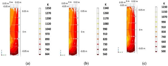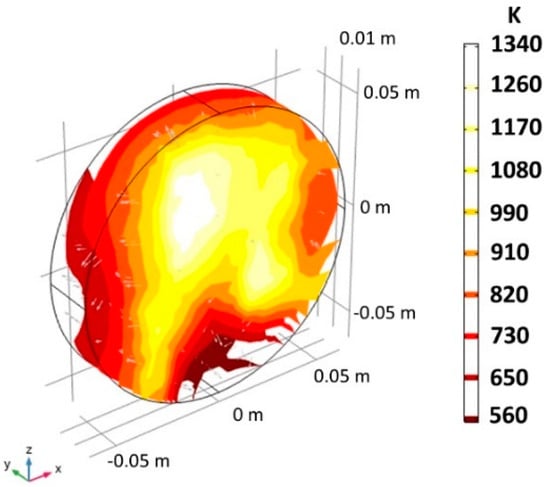 Figure 8 shows the steady-state temperature distribution in the 20 PPI absorber obtained from the numerical simulation with COMSOL. As mentioned previously, the incident radiative flux distribution was included in the numerical simulations’ boundary conditions. The radiative flux irregularities are due to the concentrator optical errors, which are augmented because the solar furnace is operated with the receiver out of focus. Consequently, the radiative flux profiles lead to an irregular and asymmetric temperature distribution. Figure 9 compares the temperature distribution for the different pore densities in the z-y plane (perpendicular to thickness) of the absorber material. It can be observed how the larger pores allow higher temperature values in the inner parts of the material due to the increased radiation penetration. Despite the irregularities, the heat transfer occurs mainly in the z-direction.