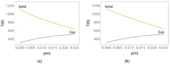Temperature of the solid and the gas as a function of depth, from the analytical model, for the 20 PPI absorber with different air flowrate. (a) 30 L/min−1 and (b) 10 L/min−1.