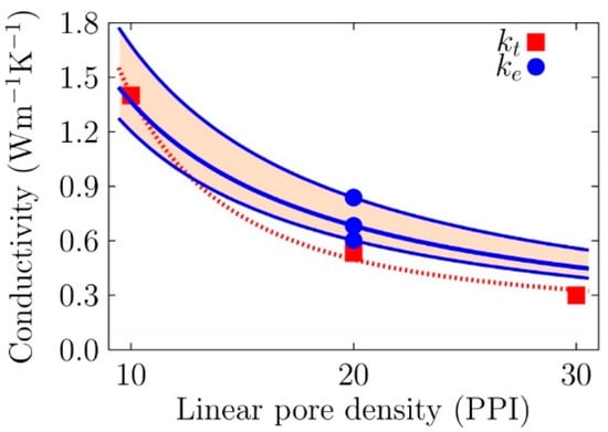 Total conductivity (kt) obtained from the simulations for different linear pore densities (red squares) and a trendline for these values (red dotted line). The effective conductivity (ke) [] for the 20 PPI absorber (black circles) with the expected scaling for this quantity (black dotted line) based on the assumption of radiation heat transfer dominance [].