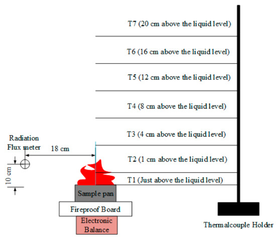 In this paper, a UW/UX series pallet electronic balance (Shimadzu, Kyoto, Japan) was used for mass measurements. Its accuracy is 0.01 g, and the measurement range is from 0 to 6.4 kg. The diameter of the circular oil pan is 10 cm, and 25 mL electrolyte sample was taken for each combustion test. A fire-proof plate made of ceramic fiber was placed on the balance, then the sample pan was set on it, which could protect the measurement device from high temperature, obtaining relative accurate data, as shown in Figure 1 and Figure 2. In order to ensure the consistency of experimental conditions in Hefei, Lijiang and Lhasa, the electrolyte was ignited directly by the same spark without external radiation heat flux. The temperature data was measured by K-type thermocouples and a type of 7018 temperature acquisition module. A radiative flux meter (STT-25-20, from Shanghai TecFront Electronics Corp. (Shanghai, China), whose response is 1.212 mV/(kW/m2)) was applied to detect the radiation flux of flame, which was located 18 cm far from the fire centerline and 10 cm high from the sample pan. The experimental platform is shown in Figure 1, and the positions of thermocouples and radiation flux meter in Lhasa and Lijiang are presented in Figure 2. Each combustion experiment was repeated more than two times.
