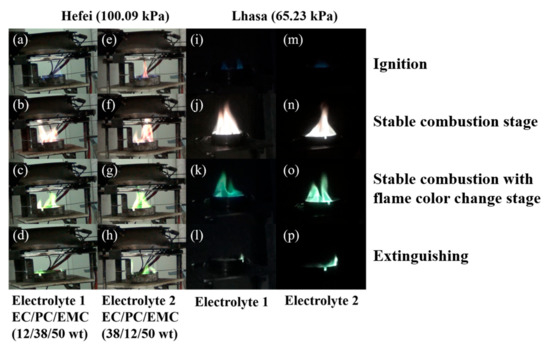 Table 3 summarizes the burning duration of two electrolytes in all the experimental locations, and Figure 3 presents the experimental phenomena of two electrolytes in Hefei and Lhasa. The combustion process of the two electrolytes were similar. First of all, the combustion process of both electrolytes could be divided into four stages: ignition, stable combustion stage, stable combustion with flame color change stage and extinguishing. Taking Electrolyte 1 (1 mol/L of LiBF4 dissolved in EC/PC/EMC with a mass ratio of 12:38:50) as an example, after the ignitor ignited the combustible vapor above liquid, flame radiation accelerated the evaporation of electrolyte, and the electrolyte pool fire quickly entered a stable combustion stage, which took 5–10 s in Hefei. The stable combustion stage lasted for about 2 min and 30 s. In this stage, the flame color was mainly yellow. Then it entered stable combustion with a flame color change stage, in which the flame height of electrolyte pool fire decreased and a small amount of visible green flame appeared at the bottom of the flame. The maintenance time of this phase was similar to that of stable combustion stage. Finally, the flame height decreased again, only a little beyond the top of the oil pan. In addition, the flame morphology was scattered around the oil pan.