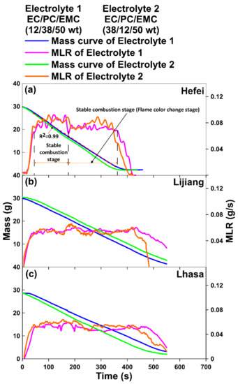 It can be seen from Figure 4a that in Hefei, the change trend of MLR curve was consistent with the observed experimental phenomena. The combustion process could be divided into four stages: ignition, stable combustion stage, stable combustion with flame color change stage and extinguishing. However, the decline of environmental pressure would cause the decrease of MLR [26,27,28,29]. In addition, the “steps” between the MLR of stable combustion stage and stable combustion with flame color change stage reduced. The main reason might be that the mass of oxygen per unit volume decreased with the decline of ambient pressure, resulting in the decrease of oxygen concentration between combustible vapor and air on the surface of electrolyte, which caused the oxygen diffusion rate lower in low pressure environment. Thus, the combustion rate was inhibited, while the MLR was reduced and the combustion time was prolonged [26,27,28,29].