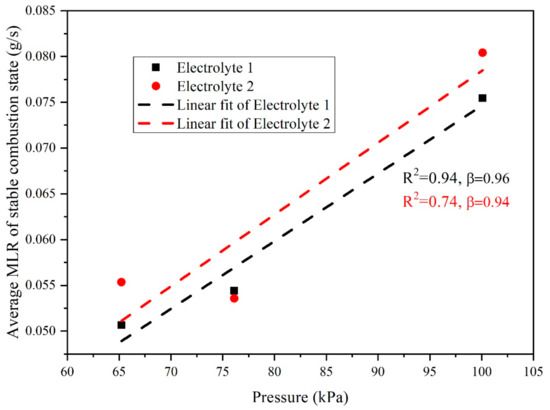 On the basis of faithfulness and accuracy, a suite of operational steps and processes was proposed in this paper. Because that the combustion process of electrolyte in this work could be divided in three stages: ignition, stable combustion stage, and extinguishing, thus only determining the two key points when the ignition transformed to stable combustion stage, and that changed to extinguishing, respectively, then the stable combustion stage could be confirmed. Therefore, based on the mass loss data in Figure 3, at first a part of data in the middle stage were selected and linearly fitted to make sure the R2 was above 0.99, then the fitted line was lengthened, which would cross the MLR, and the two points of intersection would be regarded as the key points where the combustion status changed. The stage between the two points would be defined as the stable combustion stage, then through derivation the MLR could be obtained. According to the experimental phenomena, the overall stable combustion stage could be further divided into a “stable combustion stage” and a “stable combustion with flame color change stage”, respectively.