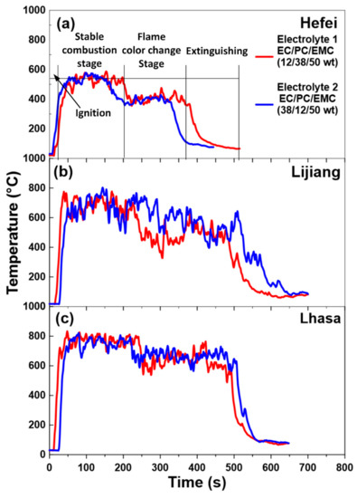 From Table 4, the flame temperature of stable combustion stage was higher than that of stable combustion with flame color change stage. The explanation for this fire behavior is that the linear carbonate EMC was the main fuel of stable combustion stage because of its lowest flash point and strongest volatility in the organic solvent mixture system. The residual organic solvents PC and EC in the solution had low volatility and combustion heat due to their ring structure. The stable ring structure led to the decrease of the free radical formation rate and the combustion rate of electrolyte pool fire, which resulted in the decrease of flame temperature.