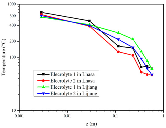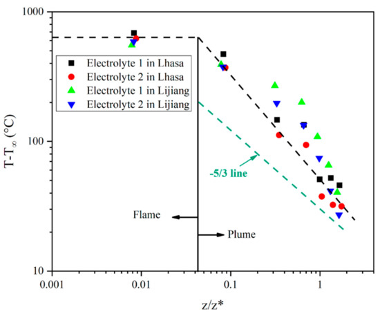 Based on the analysis of the mass loss curve, the corresponding average temperature during stable combustion stage and stable combustion with flame color change stage was obtained. Figure 6 shows the temperature curves of the flame centerline just above the liquid level of the two electrolytes in Hefei, Lijiang and Lhasa. As shown in Figure 6a, the temperature change curve of electrolyte flame corresponds well to the divided four stages of electrolyte combustion process in Section 3.1 and Section 3.2. The abscissa (X-axis) and ordinate (Y-axis) of Figure 7 and Figure 8 are in logarithmic form, but they have completely different physical meanings. In Figure 7, the X-axis is the relative height from each thermocouple to the liquid fuel level, and the unit is m, while the Y-axis is the average temperature value detected by each thermocouple during stable combustion stage and stable combustion with flame color change stage. The X-axis z/z* in Figure 8 is calculated by the relative height from each thermocouple to the liquid fuel level dividing the characteristic size z* of the fire source, which is a dimensionless ratio, while the Y-axis is the relative average temperature rise value from each thermocouple to the environmental temperature. Using z/z* is a common method to describe the temperature distribution of the flame centerline in fire science field [43,44,45,46]. Table 4 shows the data of stable combustion stage and stable combustion with flame color change stage of the two electrolytes in Hefei, Lijiang and Lhasa. Table 5 listed the average HRR during the whole stable combustion stage as Q values in Lijiang and Lhasa. As for the decrease of HRR and MLR, there was an increase of the temperature at the very surface of the electrolyte when the pressure decreased, suggesting that the radiative losses in the flame decreased when the pressure dropped, and that the flame stress exerted on the electrolyte decreased as well. Furthermore, it was consistent with the heat flux measurements, which were lower at Lhasa (65.23 kPa) than at Hefei (100.09 kPa).
