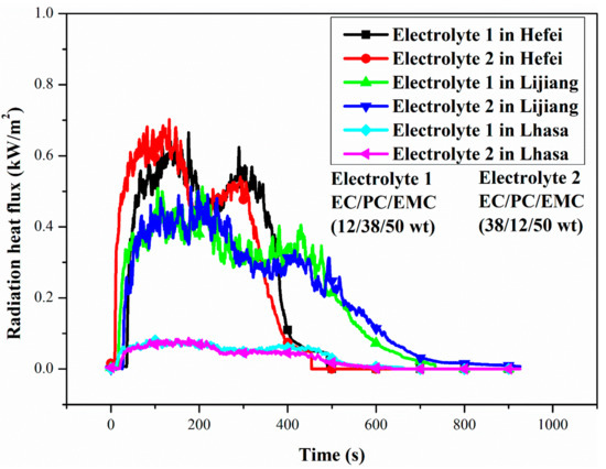 Figure 9 illustrates the radiation heat flux of two electrolytes burning in Hefei, Lijiang and Lhasa. As shown in Figure 9, the change trend of electrolyte in Hefei and Lijiang was similar, which could be corresponding with the previously divided four combustion stages. However, the radiation heat flux generated by electrolyte combustion in Hefei rose and fell faster than that in Lijiang and Lhasa, while which can well verify that the flame radiation heat flux loss was significantly reduced at low pressure. It is worth noting that the radiation heat flux measured in Lhasa was far less than that measured in Hefei and Lijiang, which can be attributed to the decrease of the volume fraction of soot particles under low pressure [22,23,24]. From the radiation heat flux curves as shown in Figure 9, they were proportionable with the corresponding HRR curves in Section 3.5, which indicates that during the combustion process the heat radiative flux was positively associated with HRR.