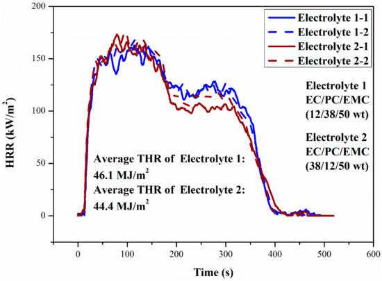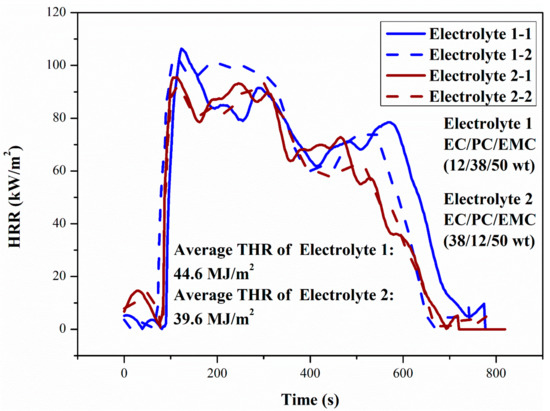 - The pHRR and THR of the two electrolytes were almost the same, but those of Electrolyte 2 were slightly lower, and its conductivity was increased by 15.8% compared with Electrolyte 1. Thus, Electrolyte 2 has a relatively lower fire hazard and better comprehensive performance.