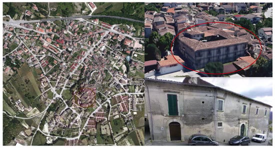 The IAQ analyses were carried out on “Palazzo Galeota” (Figure 2), a 15th century building of elevated historical and architectural value situated in Poggio Picenze, L’Aquila (Italy). The structure, built on ancient hypogeal built environments, was damaged by the 2009 earthquake that in 2009 hit the Abruzzo region []. The building suffered serious damage, such as the partial collapse of floors and cracks along the bearing walls. The structure has not yet been repaired but has been secured by a still standing external metal pipes grid. Palazzo Galeota, constructed in mixed masonry brickwork stones, had a wood covering. In particular, the palace showed many other historical features (e.g., original windows with wooden frames and single pane glass), no thermal insulation for the historical envelope and no heating, ventilation and air conditioning (HVAC) systems.