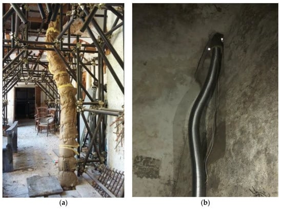 In the palace, a duct that connected the basement to a room at the first floor was installed, transporting cold air from the hypogeal level (Figure 3 and Figure 4). The duct, realized in steel material, had a circular section of 25 cm diameter and was 10 m high. For the duct, a flexible stainless steel pipe was used, which is commonly inserted into existing flues, and soft rock wool for insulation. None of the already insulated pipes were used because in the initial experimentation phase of the ventilation, the insulation was gradually removed. After the 2009 earthquake, the historical windows were removed and the openings were sealed with a transparent PVC sheet in order to favor the solar gains and an increase of indoor temperature, producing a hothouse effect similar to the previous glazing system.