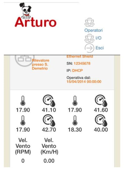 VOC and air quality sensors (CO2, MQ2, HCHO, IAQ) were installed in the room reached by the ventilation duct prototype (Figure 8). The Grove Air Quality Sensor V1.3 is an indoor air quality sensor, which can detect a wide variety of gases such as carbon monoxide, alcohol, acetone, solvents and formaldehyde in a range between 10–1000 ppm. The sensors were calibrated in the laboratory and tested before installation. These sensors had the task of checking the indoor air quality in the months of July and August, when the system is at maximum operating speed, and, consequently, the air flow is higher []. The data were collected using the Arturo software developed by the Department of Engineering, Computer Science and Mathematics (DISIM), University of L’Aquila, Figure 9 shows the software interface.