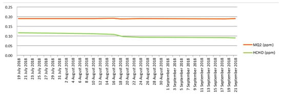 From the graph in Figure 10, one can see a linear trend without particular increase for the data monitored by the MQ2 sensor (gas sensor), as we are, among other things, in an isolated and not particularly busy area. For the green curve relating to formaldehyde data, we see an improvement, as the operation of the ventilation duct improves this parameter.