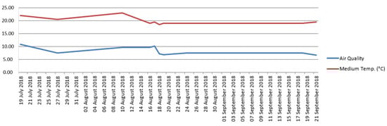 Overall, the graph in Figure 11 shows, however, that with the decrease in temperature, the quality of the indoor air also decreases as a whole, as the curves are almost parallel. This aspect will have to be studied in depth to understand which parameter has the greatest influence and apply the necessary devices in order to reduce indoor pollution caused by the operation of the ventilation device.