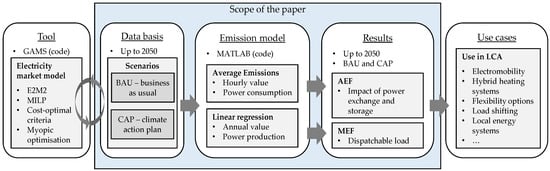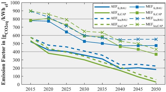 Therefore, this research is the first to calculate prospective hourly average emission factors of electricity consumption (AEF) using normative scenarios, and the first to calculate a future annual marginal emission factor (MEF) using the linear regression method for Germany until 2050. For the calculation of direct MEFs, the explicit use of normative scenarios is recommended without implied large-scale influences on electricity demand []. The data we use is derived from two different normative scenarios for the development of power production in Germany, based on different CO2 caps using an electricity market model. The emission factors are determined with and without upstream emissions of the energy carriers and other environmental impacts, which is a novelty for emission factors of the German power supply as well. With the developed AEF, electricity from import, export, and storage is also taken into account. These emission factors can be used to produce more detailed analyses of the future GHG emissions from the use of sector coupling technologies in Germany. The results will be made available for open-access use in life cycle assessment (LCA) and for integration in life cycle inventories (LCI).