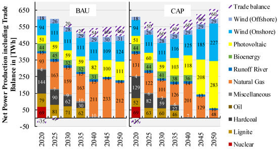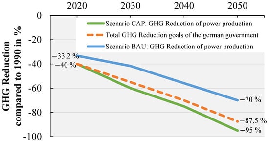 In the Climate-Action-Plan (CAP) scenario, the emissions cap for the energy industry is adjusted in line with the total emission reduction of the German climate action plan (as shown in Figure 2). This means that GHG emissions from power production will be reduced by 95% in 2050 compared to the base year 1990. The share of renewables in NPP is 92% (2030:50%). The development of demand and the maximum power exchange balance of the two scenarios was based on the scenarios of the study “Klimapfade für Deutschland” []. In the scenarios, Germany develops from a net power exporting country to a power importing country with a maximum power exchange balance of 60 TWh per year. This external model parameter limits the annual power exchange balance to the highest value that has occurred in Germany in the last 30 years. The assumption of a higher demand in the CAP scenario is driven by more electrification measures in heat supply and transportation sectors. This means that two scenarios are formed as a data basis, which show a different but possible development of power production in Germany and enable an illustration of the method that has been applied and developed. The results of the optimization model are shown in Figure 3 and Figure 4.