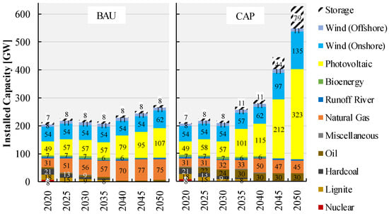 Results of the linear programming of the electricity market model E2M2: Installed capacity of the two scenarios BAU and CAP to the year 2050. Values below 3 TWh are not labeled.