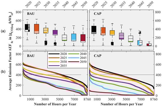 The duration curves for the two scenarios shown in Figure 5 illustrate the wide range of the developed AEFs. The median of the annual AEFfc decreases continuously due to the forced phase-out of coal combustion in both scenarios. The coal phase-out is clearly shown by a jump in the duration curves from 2035 onwards. Merely in the BAU scenario, the AEFfc decreases only insignificantly from 2040 on. Caused by the phase-out of bioenergy, despite meeting the emissions cap, the median even rises slightly to 2045. The spread of the values and also the peak AEFfc remain constantly at a high level and only reach lower values in 2050 in the scenario CAP, where the highest AEFfc is then 100 gCO2eq/kWhel. The AEFfc can drop much further in CAP and reach almost 0 gCO2eq/kWhel, because the expansion of RES and electricity storage massively increases. Due to the applied calculation method of GHG emissions from electricity storage and must-run restrictions, reaching exactly 0 gCO2eq/kWhel in these scenarios is almost impossible. Furthermore, for imports from the EU for the years 2045 and 2050, in some hours the power is already being produced exclusively emission-free. Overall, in 2050, CAP in 3709 h and BAU in 660 h will fall below 10 gCO2eq/kWhel.