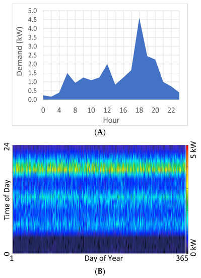 The load profile considered in residential buildings included total average energy consumption of 25 kilowatt-hours per day with a peak load of ~4.5 kilowatt (combined electrical and thermal loads). These values are based on the average energy consumption numbers provided by U.S. Energy Information Administration (EIA, Washington, DC, USA) [47,48]. As shown in Figure 1, the generic load profile is meant to represent the peak demand profile rather than a particular building type and actual consumption in a specific geographical region. Figure 1, for instance, displays the total load as a function of time of the day along with peak consumption periods during the course of the day.