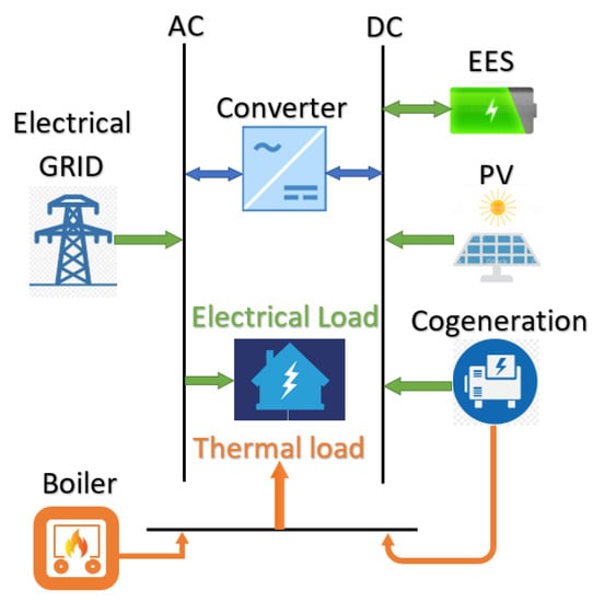 The hybrid energy architecture considered for this analysis involved an (i) electrical battery module (2 kWh battery, 4000 kWh lifetime throughput), (ii) a boiler serving the thermal load via natural gas (85% efficient) after utilizing the heat recovered from the power source (if needed), (iii) an optional auxiliary PV power source, and (iv) a converter (95% efficient), as shown in Figure 2. Additional thermal energy storage was not considered in this analysis as the goal was to minimize the excess energy production and the boiler utilized will act as the on demand thermal provider, essentially acting as a thermal storage hardware. As shown in the schematic, power sources such as electrical grid, generator and PV are shown as connected to the alternating current (AC) bus while battery resides on the direct current (DC) bus. The direction of energy flow between the source and the consumer is shown along with the load profile type and daily energy consumption rating. The software prioritizes electrical power utilization in the order of primary load on the same bus, followed by the energy storage module, before finally being sold to the electrical grid.