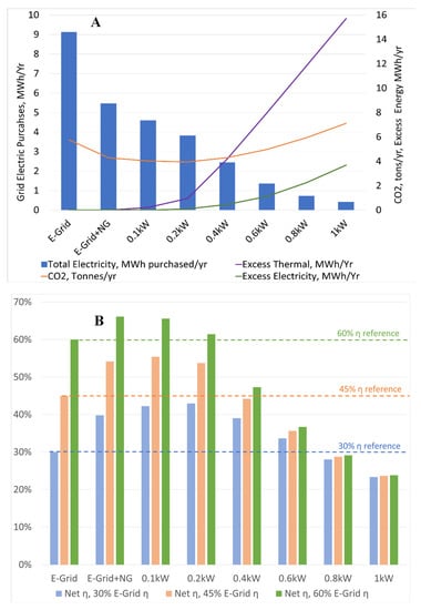 Influence of generator power scale on E-Grid demand, total carbon dioxide emissions, excess electrical and thermal energy produced, and net combined efficiency of the residential energy system. (A) CO2, E-Grid purchases vs. different configurations. (B) Total energy efficiency vs. cogeneration system power rating. No PV or thermal energy storage in the cogeneration system configuration.
