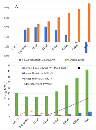 Installation of the cogeneration system also results in operational energy cost savings of up to 80%, as shown in Figure 4, mainly driven by the lower price of natural gas and the waste heat produced by the PM in supporting the thermal load, which otherwise would have been supported by E-grid. The operational cost savings presented here account for the excess electricity produced via net metering at a cost of $0.1/kWh. Figure 4B also displays the total primary energy, defined as the combined kWh energy associated with the electrical grid and fuel. The primary energy was calculated after taking into account the energy consumed at the source/generation. A 45% central power plant electrical energy efficiency was assumed for the E-grid portion of the energy supply to the building while a 92% efficiency factor was assumed for the natural gas supply (to account for distribution losses) [67]. As shown, the primary energy consumption of hybrid E-grid/NG configurations of up to 0.2 kW is lower compared to the E-grid only energy supply. In addition, deploying >0.4 kW PM does not require additional natural gas fuel to support the thermal load, but higher power output (>0.4 kW) from the cogeneration system also produces excess thermal and electric energy. The difference in additional boiler fuel and excess thermal energy reflects the thermal balance if a thermal storage component is included in the configuration. For instance, for the 0.2 kW system in Figure 4B, the additional boiler fuel and excess thermal energy converge, implying that the system is thermally balanced if a thermal storage unit is employed.