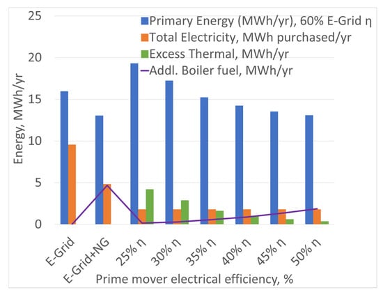 Figure 5 displays the primary energy consumed with an all-electric configuration and hybrid natural gas boiler plus E-grid, with and without a cogeneration system. The E-Grid efficiency was assumed to be 60% while the delivered natural gas efficiency was assumed to be 92%. It can be noticed that the 0.4 kW-based cogeneration approach consumes less primary energy (combined electric plus natural gas at source) when the electrical efficiency is ≥35%. In addition, total E-grid purchases are substantially lower with the cogeneration system (~80% lower compared with all-electric primary energy source). Additionally, as expected, excess thermal energy and total fuel consumption decreases with an increase in the electrical efficiency. The demand for additional boiler heating fuel, however, increases, (in other words, the additional thermal energy needed that is not provided by the 0.4 kW PM) if the electrical efficiency of the PM is above 30%, as can be realized in the difference between additional boiler fuel and the excess thermal energy.