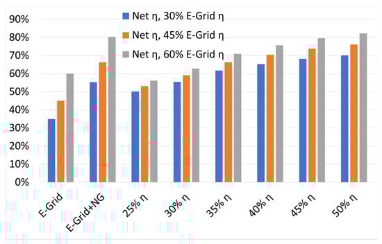 Figure 6 shows a comparison of total energy efficiency of each configuration (all with 0.5 kW PV) while supplementing electrical grid with energy efficiencies of 35%, 45%, and 60%. As displayed, fuel-supported configurations exceed the E-grid-based configuration at efficiencies of 35% and 45%. However, above 60% electrical grid efficiency, the cogeneration configuration must surpass at least 35% electrical efficiency to provide energy benefits.