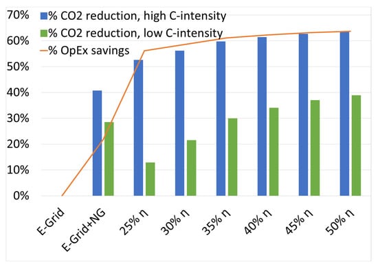 In addition to the energy benefits, the impact of the cogeneration system’s electrical efficiency on the operational expenditure and carbon dioxide footprint was also evaluated. As displayed in Figure 7, two different E-grid sources representing low and high carbon intensities of 0.42 kg CO2/kWh and 1.004 kg CO2/kWh electric production [66], respectively, were considered. It can be noticed that natural gas cogeneration system configurations show > 53% reduction in CO2 emissions if the grid electric supply is from a high carbon intensity power plant. However, compared to low carbon intensity power plants (i.e., high penetration of renewable resources), the cogeneration system’s impact on CO2 reduction is less effective, yielding < 39% reductions. The cogeneration approach also has a positive impact on lowering the operational expenditure. As shown, the net operating expenditure savings can exceed > 55%, with the highest realized from the most energy-efficient PM (50% electrical efficiency), demonstrating ~64% reduction in operational cost.