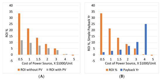 Economic analysis of the cogeneration system. (A) Influence of cost on ROI, with and without PV. (B) Payback period at different cogeneration system costs (no PV).
