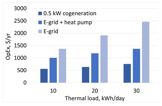 Annual operational expenditure of different system configurations with variable thermal loads: 0.5 kW cogeneration system at 40% electrical efficiency (2 kWh EES), heat pump with COP 3.0, and baseline electrical grid supported heating system (COP = 1.0); 15 kWh/day of electrical load, no PV.