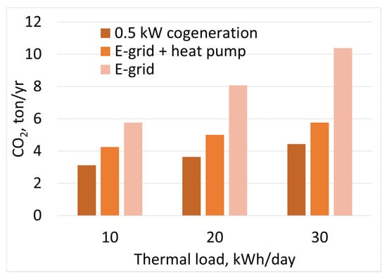 Heat pumps are most efficient in serving the thermal loads of a building. Hence, the performance of a 0.5 kW cogeneration system was compared with that of a heat pump (COP 3.0), and also with a resistive heating system (COP 1.0), both supported by electrical grids with a carbon dioxide factor of 0.63 kg/kWh. The residential building’s average electrical load was assumed to be 15 kWh/day, while the average thermal load was assumed to be 10 kWh/day. The electrical efficiency of the cogeneration system was assumed to be 40%. The analysis presented in Figure 9 and Figure 10 accounts for the complete utilization of the excess thermal energy (via thermal energy storage) produced by the cogeneration system. Figure 9 compares the annual operational expenditure of the three configurations examined. The 0.5 kW cogeneration system is cost effective at all thermal loads considered. The heat pump system is the second most cost-effective solution from an operational economics viewpoint.