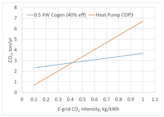 Annual carbon dioxide emissions of a residential building served by a 0.5 kW cogeneration system (40% electrical efficiency) or E-grid-supported heat pump system (COP-3).