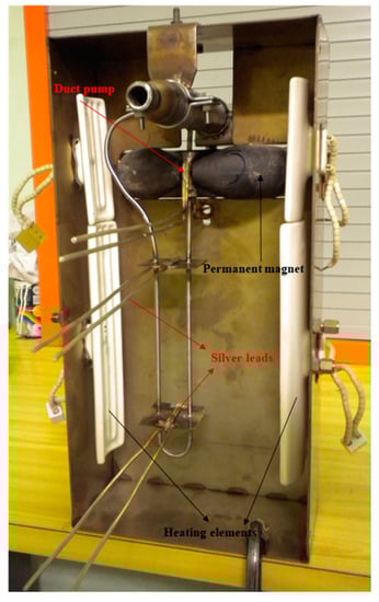 The electrical resistance is measured between two metal plates (40 mm × 40 mm, 2 mm thickness, 150 mm one from the other), which intersect the measurement capillary and where silver electrical leads are connected both to bring the electrical current and to acquire the voltage drop (BINT 20024 Precision Nano-ohmmeter is employed for this purpose). From Figure 1, it is also possible to see that all the apparatus is housed inside a steel parallelepiped box, and that along the lateral inner walls of this box are mounted four heating elements (two on each side), which permit one to control the desired temperature inside. The box, open in the figure, is closed during normal operation in order to minimize the heat losses to the external environment.