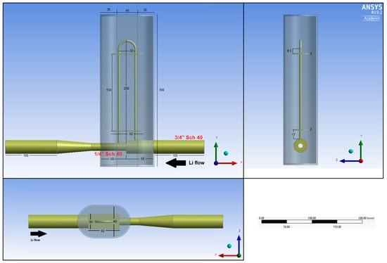 For the replacement of the electromagnetic pump, an appropriate analytical design of the Venturi suction was performed by keeping the 1 s travel time of lithium inside the capillary (i.e., mass flow in the capillary) and minimizing the irreversible pressure drop through the Venturi. Owing to this effort, the general dimensions of the pipes were fixed (Figure 2). The Venturi geometry foresees an inlet pipe of ¾ ̎ sch 40 followed by a sudden restriction to a ¼ ̎ sch 40 and a 10° angle divergent to the ¾ ̎ sch 40 outlet pipe.