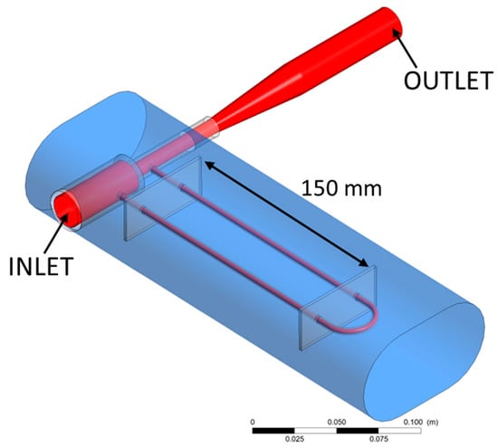 The CFD model developed (Figure 3) includes the Venturi suction described in the previous paragraph, the U tube capillary (the pipe inner/outer diameter of 3/4.8 mm and the curvature radius of 32 mm were kept from the previous configuration) with the two steel measuring plates (again at a distance of 150 mm from each other) and the air in the box surrounding both the capillary and the main pipe. The RM box is a parallelepiped flat oriented 30 cm long and 10 cm × 6 cm rectangular rounded base. The whole model includes three main domains: the lithium flowing in the RM, the piping steel inside the box and the air inside the RM box. The conjugate heat transfer between lithium, steel and air is set owing to the General Grid Interface (GGI) algorithm that links nodes on different domains (solid and fluid) facing each other. No heat source was included in the RM air box looking for an estimation of the thermal losses.
