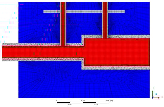 As an insight into the selected mesh B (Figure 4), the grid is fully structured in the lithium domain (red) and in the capillary pipe, while it is unstructured in the solid domain (grey) that includes the pipes and the measuring plates on the capillary.