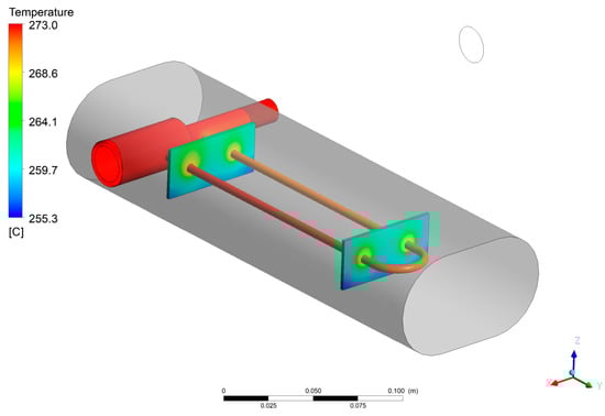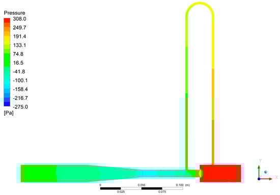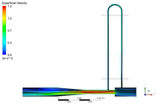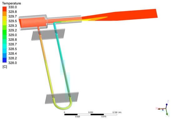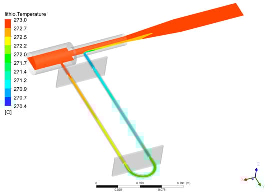 Regarding the temperature field (Figure 12), lithium flowing inside the main pipe (Venturi suction) keeps its inlet temperature, while lithium flowing in the capillary experiences about 1.5 °C decrease because of the thermal losses in the box, 25% less if compared with previous results but with a higher velocity (mass flow) through the capillary. As for the previous case, in Figure 12 one can clearly observe, from the contour bands across them, the thermal effect of the steel plates on the flowing lithium enhancing thermal losses to the surrounding air.