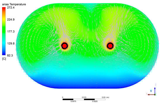 Regarding the temperature field in the air domain, the temperature contour of Figure 9 highlights a high temperature gradient from 82 °C on the lower surface to about 170 °C on the upper one; this remarkable temperature gradient is a perfect example of how natural circulation works. In the upper air region, the buoyancy forces produce air convective vortices over the capillary (granting a temperature mixing), while the lower air volume under the capillary is stagnant because the cold box surface is under the hot capillary and natural circulation cannot take place.