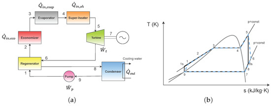 The ORC under analysis consists of seven main elements: (i) super-heater, (ii) turbine, (iii) regenerator, (iv) condenser, (v) pump, (vi) economizer and (vii) evaporator. Both the elements and the T–s diagram are depicted in Figure 1. Two cycles are considered in the analysis: the ideal cycle (in which irreversibilities are not considered) and a second cycle including the irreversibilities in the turbine () and in the pump (). The ideal cycle is represented in the T–s diagram with the states and (for the pump and turbine, respectively), whereas when considering the irreversibilities, such states are denoted as 1 and 6. Referring to such figure, note that the working fluid follows several processes: