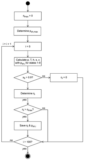 - If the performance of the cycle exceeds the maximum performance (), the value of is updated () and the super-heater pressure () is saved. After that, the algorithm proceeds.