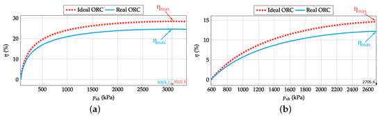 The algorithm presented in Section 3 was run for the 12 working fluids under analysis (refer to Table 2) in Matlab and the CoolProp library. The maximum performance of the ORC (), together with the optimum super-heater pressure () were obtained. These results are summarized in Table 3. As can be seen, when considering the irreversibilities of the turbine and the pump, the maximum performance is slightly reduced, as the performances of such elements are considered (). It is also interesting to remark that the optimum super-heater pressure () is not always the same for both ideal and real cycles (R11, R123, R134A, R141B, R245FA, ammonia and water). However, in such cases, both optimum super-heater pressures are similar, with a maximum difference of 2.5% for the working fluid R245FA. Only for ammonia and water is such difference increased, as the quality at the turbine output is not fulfilled in many cases. For the other five fluids (R11, R141, R1234YF, R1234ZE and R236EA), this optimum pressure () is the same for both cycles, and equal to the maximum value considered (), which was set to 80% of the critical pressure, as presented in Section 3. Figure 3 shows two examples of working fluids, including both the ideal and real ORC, and the maximum performances () and the super-heater pressures at which such are obtained. As can be seen, working fluid R141B reaches its maximum performance at different super-heater pressures depending on the kind of ORC (ideal or real), as was mentioned previously. In contrast, R1234YF achieves the maximum performance at the same super-heater pressure, which matches up with the last pressure considered. The reason why some working fluids get their performance at such maximum super-heater pressure under analysis is due to Carnot’s efficiency, as the higher the heat input temperature of the hot source, the higher the equivalent cycle efficiency.