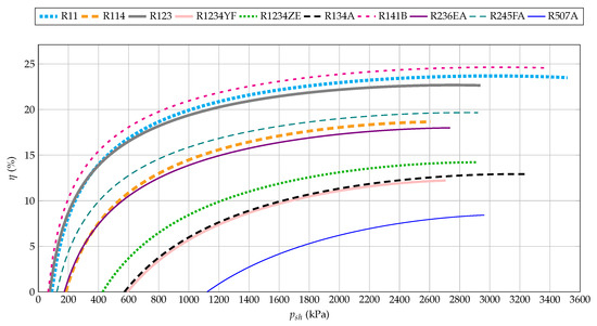 - Group 2. These working fluids start to carry out the ORC for super-heater pressures between kPa. Their performances do not increase as quickly as for Group 1, having performances around 15% for kPa. The maximum performances are in between 15 and 20% for kPa. This group includes R245FA, R114 and R236EA, which have an output temperature of the super-heater () in between K. Among the three working fluids included in Group 2, the authors recommend the use of R114 due to the lower values of GWP and ODP.